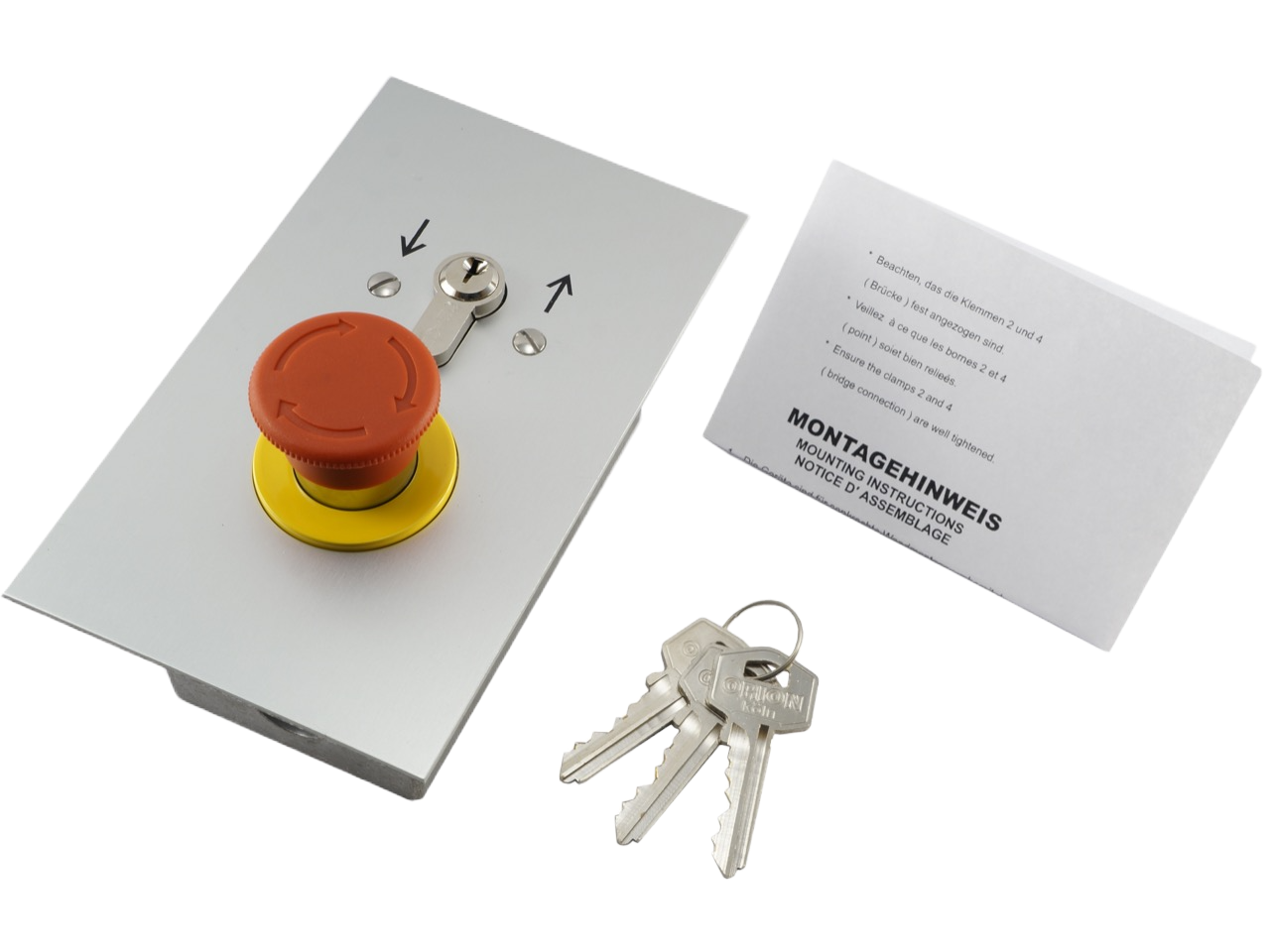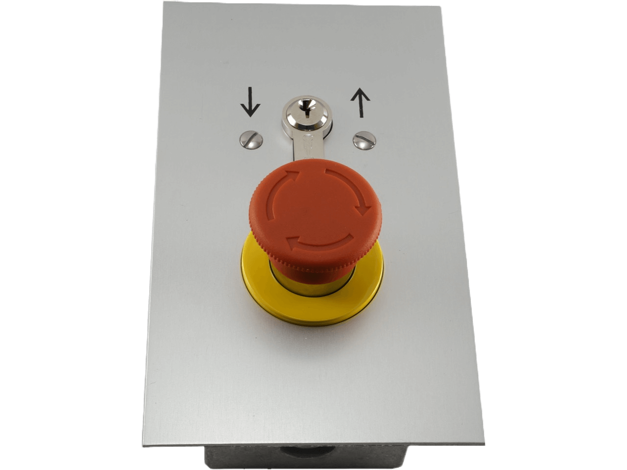 Key-switch in flush-mount aluminium enclosure, IP55 rating, 2-sided impulse switch, up/ down function and emergency-stop button, with cylinder lock and 3 keys